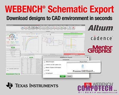 德州儀器矽谷類比事業群 (前美國國家半導體) 於 1999 年推出 WEBENCH,全球工程師已採用此獲獎肯定的 WEBENCH 免費工具,建立超過 200萬的設計數量。雖然這些工具明顯簡化設計,加速設計時程,但將設計匯出到需要授權的 CAD 開發平台還是相當耗時。TI 在 CAD 開發平台製造商的協助下開發出 WEBENCH Schematic Export,現在工程師可立即將電源及 LED 照明設計等匯出至各種平台,例如Cadence OrCAD Capture CIS、Mentor Graphics DxDesigner 及 Altium 格式,如Altium Designer等。詳細資訊,請參考介紹影片:www.ti.com/webenchex-prv。
