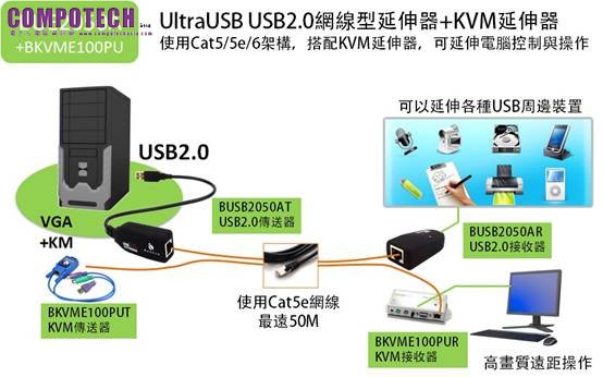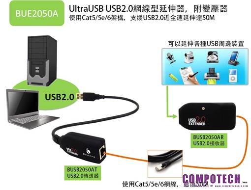整合網線的優良施工性及USB2.0周邊延伸需求,台灣電腦連結周邊廠商BENEVO推出一款Cat5 USB2.0周邊設備延伸器(BUE2050A),可以讓您使用一般Cat5/5e/6網線,將USB2.0周邊以接近全速的效能延伸達50公尺。使用這樣的架構,讓您可以使用最簡單的網線佈線,然後讓高速的USB2.0裝置從遠端連結電腦,像是高畫質監控攝影機、USB2.0超高速網卡、專業影像擷取裝置、多功能事務機、外接儲存裝置等。
