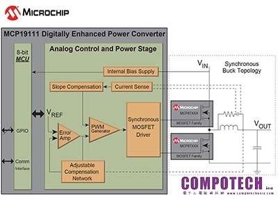 MCP19111數位增強型電源類比系列可在4.5V至32V的寬廣電壓範圍內工作,與傳統類比技術的解決方案相比,靈活性顯著提升。事實上,MCP19111是世界上第一款採混合型式的混合信號電源管理控制器,整合了一個帶有全功能快閃記憶體微控制器及類比式PWM控制器。該整合提供了數位解決方案的靈活度,也具備類比式控制器的速度、性能和解析度。MCP19111元件支援高達32V的運作,並提供針對同步降壓應用可軟體設定的整合MOSFET驅動器。當與Microchip的高速MOSFET擴展系列結合使用時,MCP19111驅動元件可客製化做為高效率功率轉換。