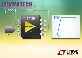 2013年1月31日 – 凌力爾特(Linear Technology)日前發表 LTC6090,其為一款精準運算放大器,可操作於達140V (或 ±70V) 的供應電壓。結合軌對軌輸出、 3pA (典型值)輸入偏置電流、1.6mV 最大輸入補償電壓及3.5µVP-P 低頻雜訊,提供了高效能ATE、 壓電驅動器及 DAC 緩衝應用所需的精準度。強化的19V/µs斜率使輸出可於低於 8µs達到140V擺幅。 增益頻寬乘積則為 10MHz。