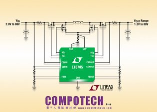 LT8705可透過單一電感及4個開關同步整流操作於2.8V至80V的寬廣輸入電壓範圍,並提供1.3V至80V輸出。透過單一元件可提供高達250W的輸出功率,當多個電路並聯時可實現更高的輸出功率。操作頻率可於100kHz和400kHz間進行選擇,並可同步化至外部時脈。 LT8705採用專利的電流模式控制架構,可於降壓或升壓模式實現定頻操作,同時具有強大的晶片上四組N通道MOSFET閘極驅動器。用戶可從強迫連續、不連續及Burst Mode®操作模式中選擇操作,以將輕負載效率達到最高。