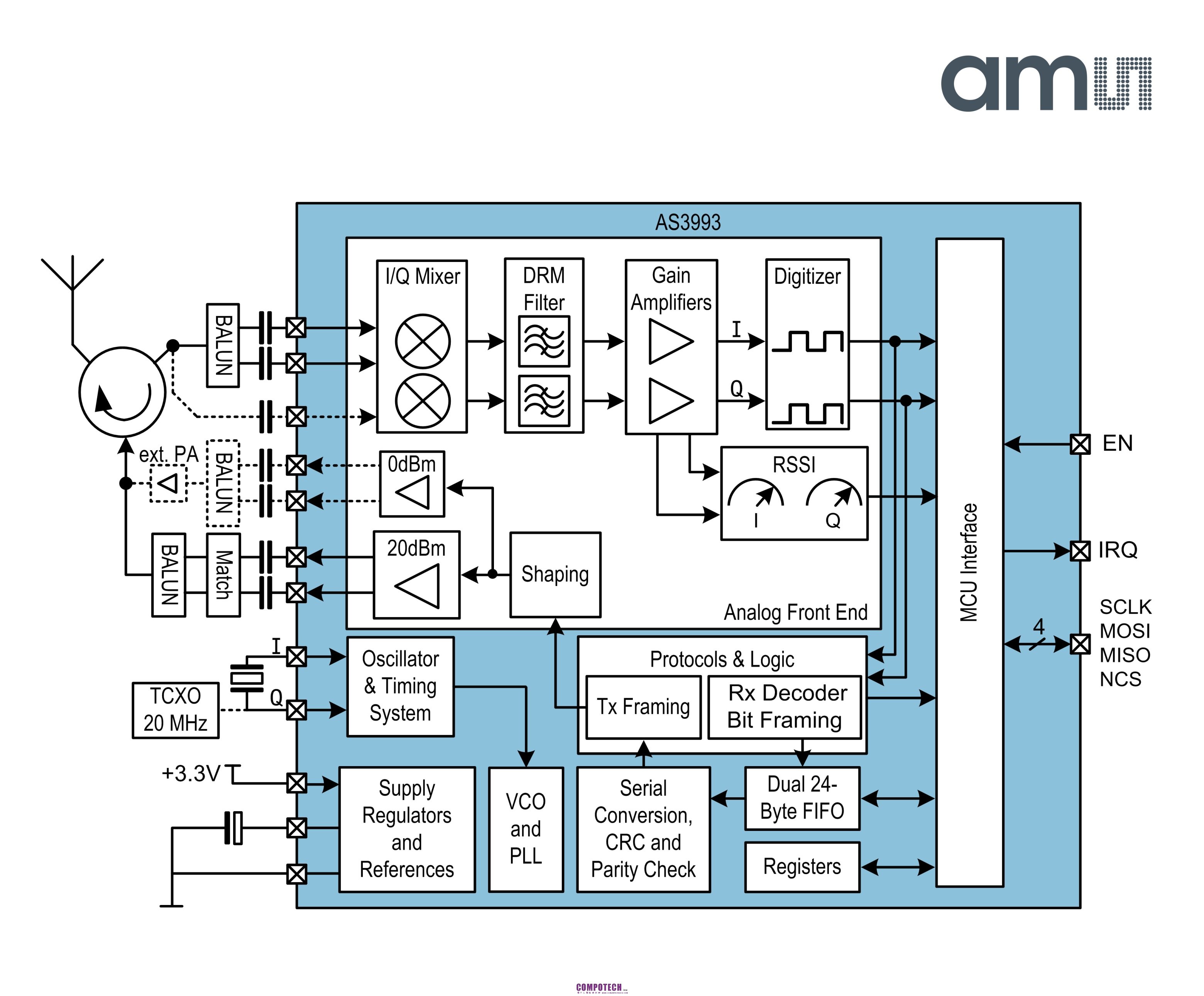 AS3993是專為行動、空間受限或嵌入式應用設計的EPC Class 1 Gen 2 RFID讀取器,可以完美滿足這些需求。該晶片採用QFN48 7毫米 x 7毫米小型封裝,帶來優秀的無線廣播效能,提供來自內部功率放大器(PA)的20dBm高輸出功率,或來自外部功率放大器(PA)的高線性0dBm輸出功率。-90dBm的可選擇靈敏度支援小型、嵌入式天線的使用,同時能在天線反射和自干擾(self-jammer)的情況下保持靈敏的讀取能力。
