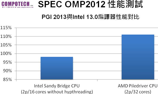 Portland Group於2013年1月28日和2月4日進行的SPECompG_base2012測試的對比成績。 OpenMP執行緒的數量與每個系統的核心數量匹配。
