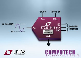 2013年3月12日–凌力爾特 (Linear Technology )日前發表14位元 4.5Msps 連續漸進暫存器 (SAR) ADC LTC2314-14,其採用精小8接腳TSOT-23封裝,尺寸較同級解決方案減少90%,相當有利於空間受限應用。此小型SAR ADC以8mm2接腳佔位內建精密的2.048V/4.096V參考,具備7ppm/ºC(典型值),並保證20ppm/ºC最大溫度係數。LTC2314-14可操作於3V或5V電源,相較於其他競爭產品功耗最低(18mW@3V或31mW@5V)。透過串列SPI介面,精小接腳佔位和非常低的功耗,使LTC2314-14成為廣泛可攜式和空間受限之應用的理想選擇,諸如醫療設備、通訊系統和電池供電系統。