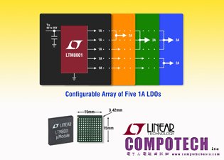 2013年3月13日 – 凌力爾特(Linear Technology Corporation)日前發表一款結合5組低雜訊1A線性穩壓器陣列的降壓µModule®(微型模組)穩壓器LTM8001。該線性穩壓器可根據電流共享輸出的數量和組合而配置,以提供2A、3A、4A或5A。元件採用15mm x 15mmx3.42mm球柵陣列(BGA)封裝,經由內建的同步降壓轉換器供電5組低雜訊線性穩壓器,可提供從輸入源的高效率轉換,範圍為6V至36V。每組輸出電壓並可於0V至24V調整。 LTM8001特別設計以供電基於FPGA、DSP、ASIC和微處理器的多軌系統。