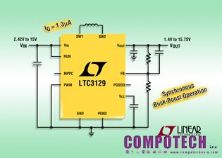 2013 年3月19日– 凌力爾特(Linear Technology)日前發表同步升降壓轉換器LTC3129,可從單一或多顆電池、太陽能板和超級電容等各種輸入源提供高達200mA的連續輸出電流。其2.42V至15V之輸入範圍和1.4V至15.75V的輸出範圍提供了當輸入高於、低於或等於輸出時之穩壓輸出,低雜訊升降壓架構提供了於所有操作模式下的連續轉換,使其成為必須保持恆定輸出電壓之應用的理想選擇,即使輸入電壓由輸出電壓轉換。該元件還包括可編程最大功率點控制(MPPC)功能,可確保於不理想電源之最高功率汲取,例如光伏電池。