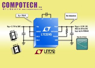 2013年3月20日 – 凌力爾特 (Linear Technology Corporation)日前發表通用型250mA高壓升降壓充電幫浦LTC3245。該元件可透過切換式電容分數轉換,在寬廣的2.7V到38V輸入電壓範圍內維持穩壓,並產生一個3.3V、5V或可調(2.5V至5V)的穩壓輸出。內部電路會自動選擇轉換比(2:1,1:1或1:2)以在輸入電壓和負載條件改變時優化效率。低操作電流(無負載18μA,關機時4μA)和低外部元件數(3個小型陶瓷電容,無需電感)使LTC3245非常適合低功耗、空間受限的汽車/工業應用,如汽車ECU/收發器電源、工業內務管理電源和高效率、低功耗12V至5V轉換。