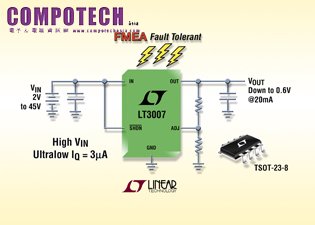 圖說: FMEA 容錯, 45V, 3µA IQ, 20mA, 寬廣 VIN & VOUT LDO