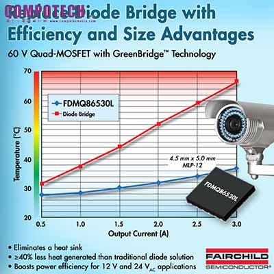 2013年5月2日--在高畫質緊湊型主動橋式應用中(如網路攝像機)產生過多熱量,可引起圖像畫質問題。 與之類似,熱雜訊也可能會影響系統的圖像感測元件,進而降低攝像機的畫質。 典型的散熱解決方案透過增加元件數量來調節熱漲落(thermal fluctuations),這使得本就複雜的設計變得更加複雜,並且使電路板空間變得更加混亂。 美國快捷半導體公司(Fairchild Semiconductor;紐約證券交易所代號: FCS) FDMQ86530L 60 V Quad-MOSFET 為設計者提供一體式封裝,有助於解決這些棘手的設計難題。