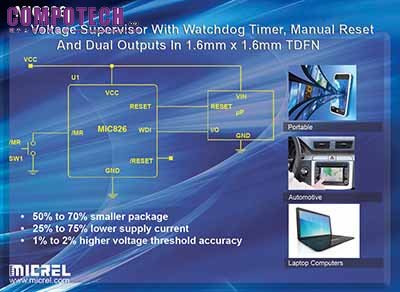 2013年5月5日—高性能線性和電源解決方案、局域網以及時鐘管理和通信解決方案領域的行業領導者麥瑞半導體公司(Micrel Inc.)今天推出精度達±0.5%的MIC826電壓監控器,該監控器採用節省空間的1.6mm x 1.6mm薄型DFN封裝,具備手動復位輸入、 監視計時器(Watchdog Timer)和雙輸出等特點。MIC826主要面向那些要求尺寸小、集成度高和電流消耗低的便攜應用。MIC826現在已經批量供應,千片訂量的價格為0.32美元/片。用戶可以通過麥瑞半導體公司官方網站http://www.samplecomponents.com/scripts/samplecenter.dll?micrel 線上訂購樣品。