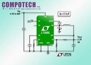 2013年6月6日 – 凌力爾特(Linear Technology Corporation )日前發表 3A, 60V降壓開關穩壓器LT3995,該元件僅需2.7µA靜態電流。 LT3995的4.3V至60V輸入電壓範圍使其成為汽車、商用車、航空電子和工業應用的理想選擇。內部4.7A開關可提供高達3A的連續輸出電流至低如1.2V的電壓。 LT3995的Burst Mode®操作提供超低靜態電流,使其非常適於汽車或工業系統等需保持always-on運作 和最佳電池壽命之應用。