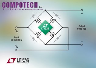 LT4320 目前供貨兩種選項: LT4320 針對DC 至60Hz 電壓整流而設計,LT4320-1則針對 DC 至 600Hz整流而設計。元件特適操作於 −40oC 至85oC 工業溫度範圍, LT4320 採用精小的8接腳