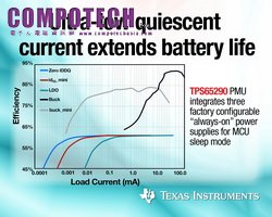 TPS65290 PMU 整合三種工廠可配置always-on電源供應選項,支援微控制器 (MCU) 休眠模式,其自動功能可從輸入電壓或升降壓轉換器選擇電源。此外,TPS65290 也可與 TI 超低功耗 MSP430 MCU 搭配運作,包含MSP430F5328等。