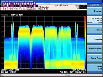 隨著微型基地台和WLAN的部署愈來愈密集,RF頻譜間無謂的信號干擾也變得愈來愈嚴重。對開發人員而言,即時頻譜分析是有力的工具,用以擷取並分析難以捉摸的信號。 安捷倫MXA 搭配RTSA 選項可提供 160-MHz 即時頻寬及業界最快速的重疊信號處理,能在極短暫地時間內準確地觸發。此外,MXA信號分析儀的頻譜遮罩觸發和各種即時顯示功能,讓工程師能準確地找出間歇性干擾問題。