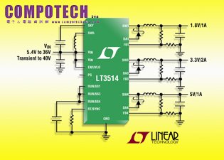 2013 年8月16日--凌力爾特 (Linear Technology Corporation )日前發表三組輸出、36V降壓開關穩壓器LT3514,該元件具備100%工作週期操作,可於低如0.8V之電壓時從一個通道提供2A的連續輸出電流,以及從其他兩個通道提供1A。該元件的3.2V至36V(40VMAX) 輸入電壓範圍使其非常適於汽車和工業等要求多個輸出之應用。 LT3514的獨特設計包括一內建的升壓穩壓器,使每個通道可操作於100%工作週期,即使輸入電壓低至3.2V。此架構使LT3514非常適合需要連續輸出穩壓之應用,例如汽車冷啟動和停止啟動(stop-start)的情況。