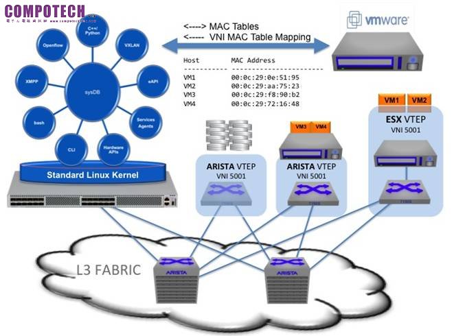 Arista的EOS使用開放控制器API,在網路與SDN控制器之間進行通訊,實現Layer 2/3雲端網路的規模。虛擬與實體網路必須共存,而非互斥。Arista平台有能力以線速傳送在各連接埠上各式各樣的網路流量,並進行流量細微控制。Arista的全新平台支援通道封裝,且具備超過個別裝置之MAC表格限制的進階配置。