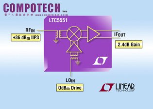 2013 年9月4日--凌力爾特(Linear Technology)日前發表一款超高動態範圍RF下變頻混頻器LTC5551,以滿足需最佳效能之應用。 LTC5551提供非常高的+36dBm IIP3(輸入三階截取點)線性度,以及9.7dB低雜訊指數,可比擬最高的IIP3被動混頻器。LTC5551不像被動混頻器一般具備7dB至9dB轉換損耗,其擁有2.4dB轉換增益,可大幅提高接收器的動態範圍。該元件還具有廣泛的RF頻率範圍能力,可操作於300MHz至3.5GHz。