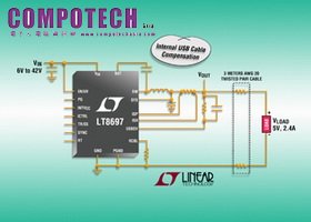 LT8697採用內部頂端和底部高效率電源開關,並將必要的升壓二極體、振盪器,控制和電纜補償電路整合於單一晶片中。獨特的設計保持了僅450mV的(2.1A時)的最小壓差,因此成為如汽車冷啟動/start-stop應用的理想選擇。內部電纜補償是可編程的,以適於電纜的長度及規格,而雙輸入回授允許在故障情況下提供額外的保護,進一步保護USB裝置。其它特點包括內部補償、電源良好旗標、輸出電壓軟啟動/追踪和過熱保護。