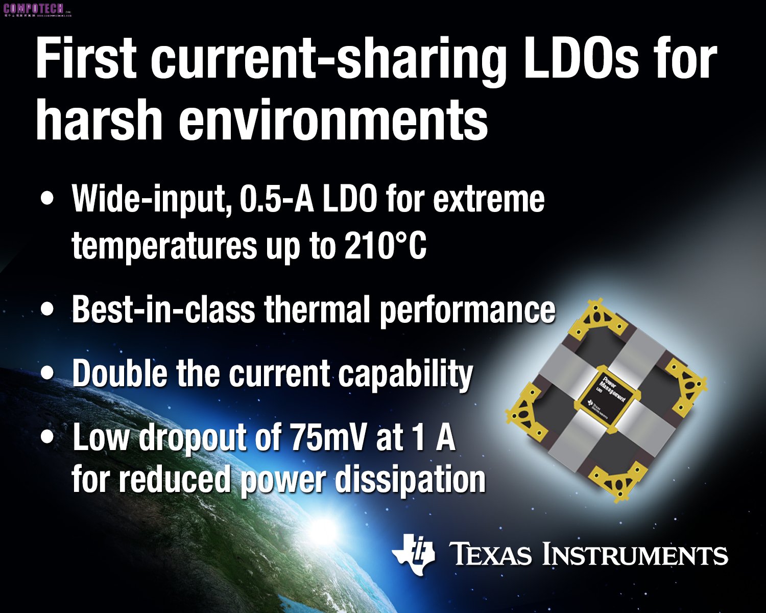 2013 年 10 月 01 日--德州儀器 (TI) 宣佈推出首批針對惡劣環境的電流共用 LDO 線性穩壓器。其 3A TPS7H1101-SP 與 0.5A TPS7H1201-HT 的電流共用特性可讓設計人員並行使用兩個元件實現兩倍輸出電流。此外,此元件還可提供優異的雜訊效能,並可最大限度降低熱耗散,提高電源效率,確保理想的系統可靠性。如欲瞭解更多詳情,敬請參訪:http://www.ti.com/tps7h1101sp-pr-tw。