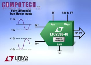 2013年10月1日 – 凌力爾特(Linear Technology Corporation)日前發表 18位元1Msps無延遲類比數位轉換器(ADC)LTC2338-18,該元件具備寬廣的±10.24V全差動、真正雙極輸入範圍,適用於高壓及工業應用,並可操作於單一5V電源,達到100dBSNR 及 -110dB THD,及具備內部2.048V(20ppm/oC 最大值)參考和參考緩衝。輸入分頻器網路可擴展和位移輸入訊號,因此不需複雜的電路來直接連接真正的雙極訊號。