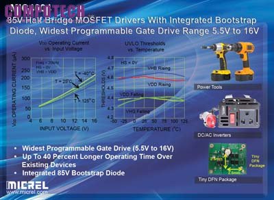 2013年9月30日— 高性能線性和電源解決方案、局域網以及時鐘管理和通信解決方案領域的行業領導者麥瑞半導體公司(納斯達克股票代碼:MCRL)今天推出了85V半橋MOSFET驅動器MIC4604。MIC4604具有集成的85V陰極負載二極體和業內最寬廣的可程式設計柵極驅動電壓範圍(5.5V至16V)等特點。這些特點使其成為業內最嚴格的電池驅動電機應用(包括電動工具和直流/交流逆變器)的理想解決方案。MIC4604採用SOIC封裝,現在已經批量供貨,千片訂量的起步價為0.69美元/片。可通過以下網站訂購樣品:http://www.samplecomponents.com/scripts/samplecenter.dll?micrel 。