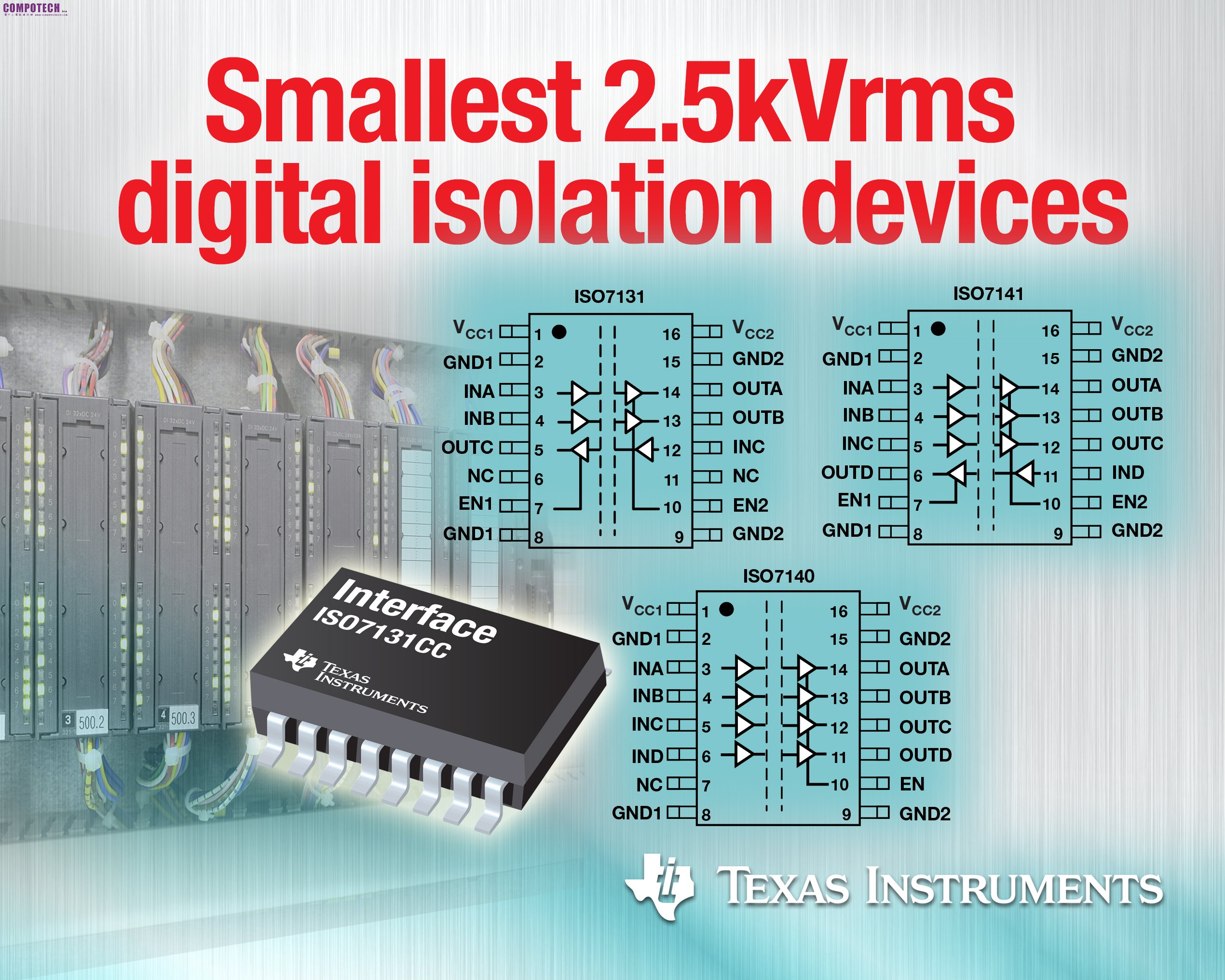 2013年10月11日--德州儀器 (TI) 宣佈推出業界第一個數位隔離元件系列,其可透過 5 mm x 6 mm 小型 QSOP 封裝提供 2.5 kVrms 的最高隔離額定值。該 ISO71xx 系列不僅比傳統 SOIC 隔離元件小 50%,且還可在相同封裝中提供較同類元件 2.5 倍的隔離額定值。在不影響針對較低隔離額定值或 EFT 突波保護效能的同時縮小電路板空間,在可編程設計邏輯控制器 (PLC) 與感測器等工業自動化應用及 DeviceNet、CAN 與 RS-485 等 Fieldbus 應用中已變得日益重要。低功耗 ISO71xx 系列隔離元件與業界同類元件相比,可提供高 2.5 倍的共模暫態抗擾度以及高 30% 的最大工作電壓,可充分滿足這些需求。如欲瞭解更多詳情或訂購樣品,敬請參訪:www.ti.com.cn/iso7131-pr-tw 。