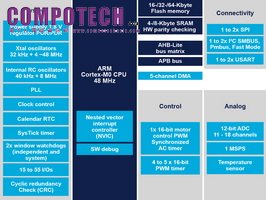 STM32F030超值型系列微控制器讓低階嵌入式設計使用的極簡設計方法成為歷史。透過降低8位元用戶熟悉的資源限制,該系列產品有助於簡化設計及提高應用性能;在擴展系統的同時,硬體的變化也很小。該系列微控制器內建48MHz ARM® Cortex™- M0、5通道DMA以及核心和通用周邊設備(如馬達控制定時器、5個通用定時器及1個1Msample/s12位元類比數位轉換器),在不犧牲性能的前提下,具有傳統8位元架構的實惠價格。