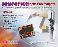 2013年10月30日--德州儀器 (TI) 宣佈推出首款支援遠端雙極結晶體管 (BJT) 溫度補償電感器電流感測的類比 DC/DC 降壓控制器,其可在高功率負載點 (POL) 轉換中將總體解決方案尺寸最小化。該 20V LM27403 DC/DC 同步降壓轉換控制器可在 25A 輸出電流下透過 12V 輸入實現超過 95% 的效率,進而可在通訊設備、工業、醫療以及電源模組應用中優化解決方案尺寸,實現快速暫態回應。LM27403 與 TI 獲獎 WEBENCH®線上設計工具配合使用,可簡化 DC/DC 轉換並加速設計時程。如欲瞭解更多詳情,獲得樣品與評估模組,敬請參訪:www.ti.com/lm27403-pr-tw。同時敬請觀看如何使用 LM27403 設計高效能轉換器的影片。