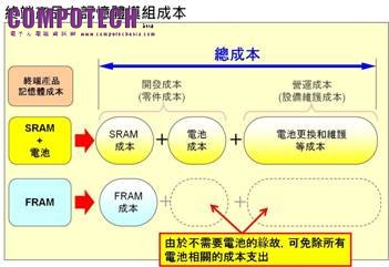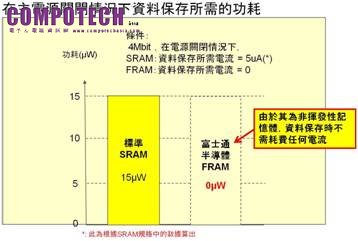 SRAM在主電源關閉的情況下將資料保存在記憶體時,需要消耗約15 µW/秒的電流以保存資料。由於FRAM為非揮發性的記憶體,在電力關閉情況下不會耗費任何電力。
