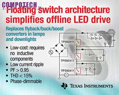 2013年11月15日--德州儀器 (TI) 宣佈推出業界首款浮動開關架構,其可簡化燈具、筒燈及固定裝置中的離線 LED 線性驅動器。該 AC 開關矩陣技術支援 TI TPS92411 浮點 MOSFET 開關,是一種無需使用兩相功率元件便可產生低鏈波 LED 驅動電流的創新方案。該架構不僅能夠與原有牆式調光器完美相容,而且還支援高功率因素與低總諧波失真 (THD)。如欲瞭解更多詳情,訂購樣品與評估模組,敬請參訪:http://www.ti.com/tps92411-pr-tw 。