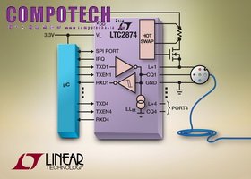 LTC2874 支援–40°C 至 85°C工業操作溫度範圍,並供貨符合RoHS標準的5mm × 7mm QFN 或TSSOP 封裝。LTC2874 千顆量購計之單價為$7.94美元起,並可立即供貨。LTC2874 補足了LT3669 IO-Link 裝置 (slave) PHY 介面。如需更多資訊請參閱www.linear.com/product/LTC2874