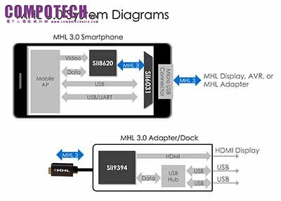 SiI8620 MHL 3.0 發射器 IC設計為與最新一代啟用 4K 超高畫質技術的行動應用處理器一起運作,而 SiI9394 MHL3.0 至 HDMI2.0 橋接 IC可連接至傳統的 HDMI 1.x 和下一代 HDMI 2.0 顯示器和監視器。而且,透過晶鐌的媒體資料通道(MDT)技術增強版本,還可同時傳輸高達 4K 2160p 超高畫質解析度視訊和 USB 資料。MDT 利用 MHL3.0 規格中所定義的高速資料通道,可同時傳輸超高畫質視訊和資料,不僅支援 USB,亦支援觸控式螢幕、鍵盤和滑鼠裝置。裝置亦已實行最新的 HDCP 2.2 加密技術以保護優質的內容傳遞程序,且與傳統的 MHL 1.0、2.0 和 HDCP1.x 標準向後相容。