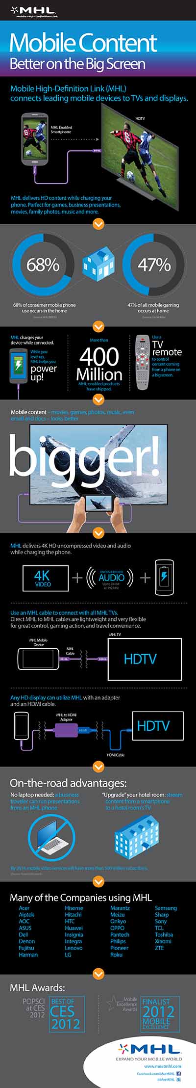 MHL 技術標準是由推廣者諾基亞、三星、晶鐌、索尼和東芝公司共同開發。MHL 聯盟目前擁有約 200 個支援 MHL 標準的開發廠商和成員,其中包括一些全球最大的行動裝置和消費電子產品公司。支援 MHL 功能的產品包括智慧型手機、平板電腦、數位電視(DTV)、監視器、投影機、AV 接收器、藍光影碟(Blu-ray Disc™)播放器、有線電視、電視配件、轉接器、車用配件等。自 2011 年首批支援 MHL 的裝置零售推出以來,MHL 生態系統持續成長,目前市場上的裝機規模已經超過 4 億部產品,而獨特產品達 300 種以上。