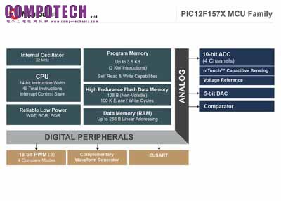 在PIC微處理控制器系列產品中,PIC12F1572以最低的價格實現了與EUSART介面之間的連結。而增加EUSART後,也實現汽車和工業控制應用的一般串列通信和LIN。新產品內建的10位元ADC,還可幫助開發人員使用Microchip mTouch™ 電容式觸控解決方案,能讓其設計輕鬆添加各種人性化的觸控應用。此外,PIC12F157X透過高耐用性快閃記憶體(HEF),能提供非揮發性資料儲存功能。而LF系列的特色則是它的低功率技術,其工作電流小於35 µA/MHz而休眠電流可低至20 nA,非常適合於各類以電池充電的設備。