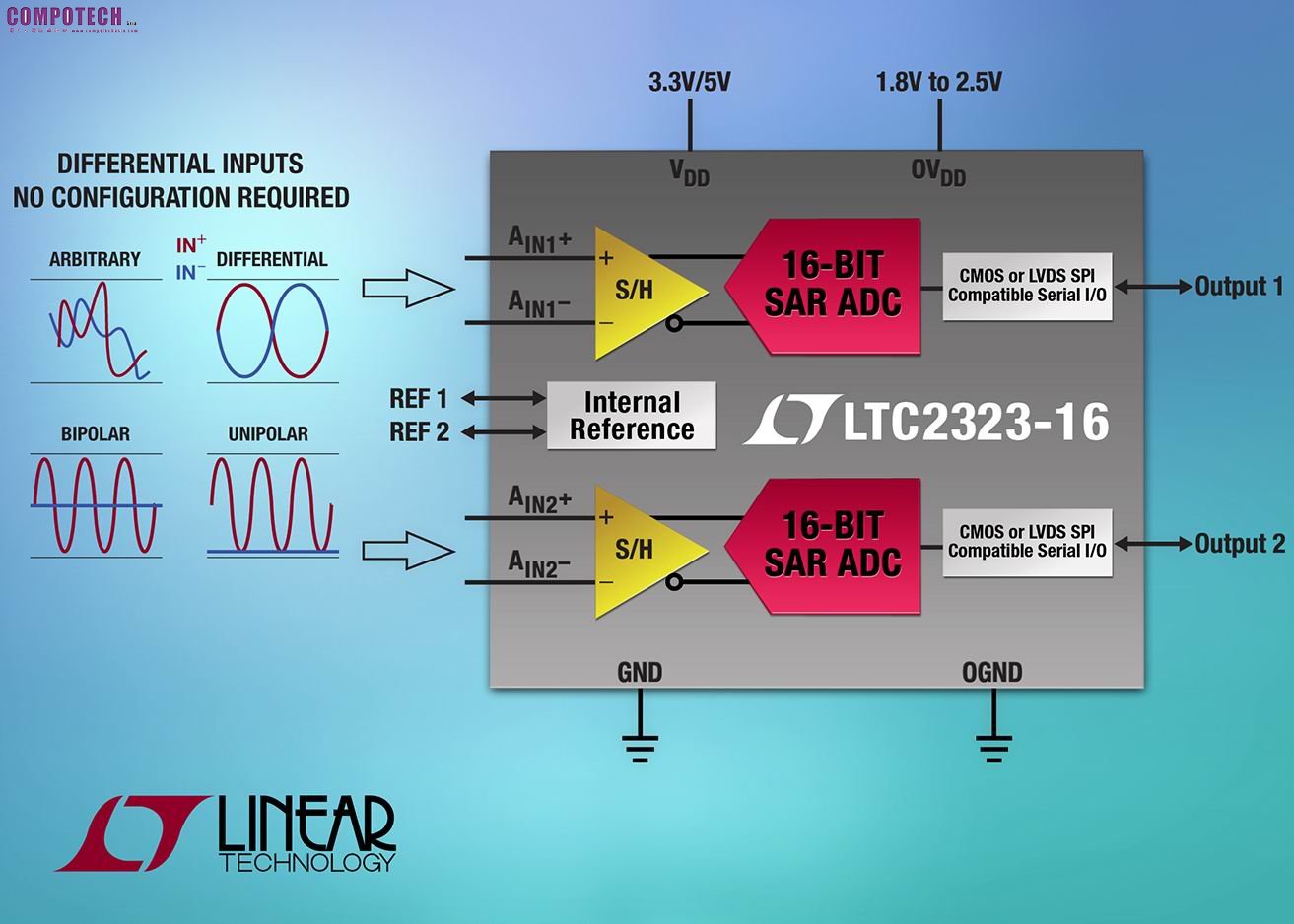 LTC2323-16系列包含16位元、14位元 和12位元SAR ADC,具有5Msps 和2Msps的取樣率,同時可實現16位元81dB SNR 、 14位元80dB SNR及12位元73dB SNR效能。14和12位元版本的訊號及量級轉移函數使其非適於控制迴路應用。LTC2323系列內建精準頻隙參考,具備低漂移,保證20ppm/ºC 最大溫度係數,並採用小型