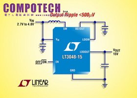 2014 年3月5日--凌力爾特( Linear Technology Corporation)日前發表一款升壓DC/ DC轉換器LT3048 ,該元件內建LDO輸出,可提供低雜訊、低漣波15V偏置電源。LT3048-15可於15V提供高達40mA的連續輸出電流,具備小於500µVPK-PK的輸出漣波和雜訊,及0.1%負載調整率。該元件可操作於2.7V至4.8V的輸入電壓範圍,因此適用於單顆鋰電池或3.3V邏輯電源軌。2.2MHz 恆定開關頻率允許使用極小的外部元件,結合2mm x 2mm DFN封裝和內建肖特基二極體,使LT3048-15 成為低雜訊偏置應用之簡單、精小的解決方案。