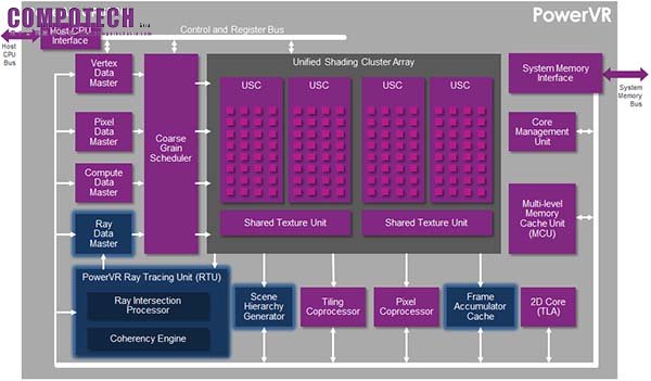 利用Imagination的Wizard光線追蹤系列核心,此專利的自訂硬體引擎能確保GPU處理器叢集無須執行複雜的著色處理,並能以最少的開發工作來產生令人驚艷的效果。這款獨特的硬體光線追蹤處理器包括了一致性收集引擎(coherence gathering engine)、固定功能交叉測試陣列以及加速場景層次產生器、從陰影接收光線,決定它們的交集並產生更多陰影。所有這些完全動態場景的實現都是透過加入創新的硬體管線,能在建立光線追蹤所需的場景層次時平行處理其他的運算,並維持與現既有可編程頂點運算的相容性。