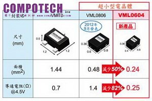 在封裝方面,内部構造的最佳化、透過導入高精度封裝加工技術,相較之前最小電晶體封裝的VML0806(0.8mm×0.6mm、高度0.36mm),嵌入面積減低50%。做為電晶體封裝成為世界最小尺寸。