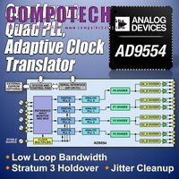 2014年5月22日--Analog Devices, Inc.(ADI)美商亞德諾公司,今天推出了AD9554這顆內建時脈倍增器的多重服務自適應四通道時脈轉換器(clock translator),為許多系統,包括同步光纖網路(SONET / SDH),提供抖動消除和同步(jitter cleanup and synchronization)。其輸入端的嵌入式交叉點開關比起維護多顆零件不同的時脈配置,提供了更大的彈性與較低的持有成本。AD9554的功率消耗只有940 mW,可同時產生多達八組從430 kHz到941 MHz範圍的輸出時脈,同步四組從2 kHz到1 GHz的外部輸入參考時脈,且迴路頻寬可低到0.1Hz。這四組全數位式鎖相迴路( all digital phase locked loop ,ADPLL )可降低外部參考時脈所帶來的輸入抖動或相位雜訊。即使所有參考輸入時脈都失效了,AD9554的數位控制迴路與自持電路系統(holdover circuitry)仍會持續產生低抖動的輸出時脈。AD9554具有自適應時脈的能力,允許使用者在鎖定狀態仍可動態改變DPLL的除頻比。