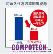 這次新研發的「BD4xxMx系列」,採用了電源領域最先進的0.35µm BiC-DMOS製程,加上ROHM最拿手的類比(Analog)設計技術,使耗電流下降到市面上一般同類品的一半以下(無負載時),大大節省了汽車的能源。此外,透過電路設計,抑制震盪用的電容不需要使用電解電容,能使用陶瓷電容,也大大削減了安裝面積。