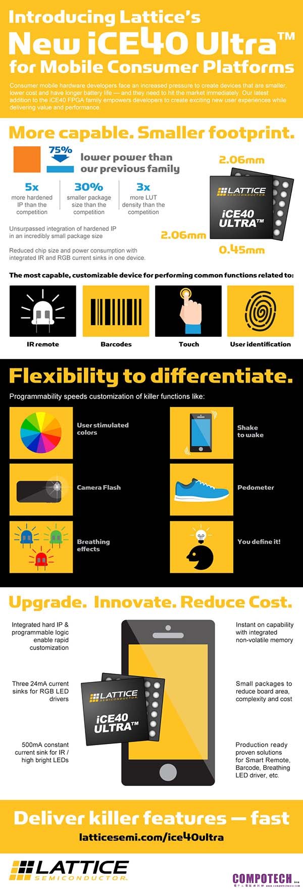 2014年7月16日--萊迪思半導體公司 (NASDAQ: LSCC) 為超低功耗、小尺寸、客製化解決方案的 FPGA 市場領導者,今日宣佈推出 iCE40 Ultra™ 產品系列,獨家整合了紅外線遙控、條碼、觸控、用戶識別、計步器等新興功能以及可供客製化的極大彈性,使消費型行動電子設備製造商能夠快速實現產品差異化的 「殺手級」 功能。