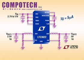 2014年7月25日--凌力爾特(Linear Technology)日前發表一款高效率、 17V 輸入同步降壓穩壓器LTC3622,可提供雙組1A的連續輸出電流至低如0.6V的輸出。同步整流提供高達95%的效率,而Burst Mode®操作僅需5µA的無負載靜態電流。LTC3622可切換於固定1MHz頻率,而LTC3622-2則可切換於2.25MHz。其定頻、電流模式架構可將切換雜訊降至最低,同時提供非常快的電壓和負載瞬變響應。LTC3622/-2可操作於2.7V至17V輸入電壓範圍,因此非常適用於單顆或多顆鋰電池應用及5V或12V中間匯流排系統。結合3mm x 4mm DFN封裝、高切換頻率和精小、低成本電容和電感,確保了高度精小的方案腳位。