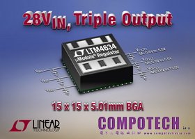 2014年8月28日--凌力爾特(Linear Technology Corporation)日前發表一款三組輸出降壓µModule® (微型模組)穩壓器LTM4634,其採用15×15×5.01mm BGA封裝,內建散熱片。高散熱效益封裝使 LTM4634 可於三組輸出(5A, 5A及 4A) 提供全電流, 於65°C 環境溫度具備超過70W 的輸出功率,具備200LFM 氣流。結合僅13個旁路電容和3個電阻,使解決方案只佔雙面PCB的4.5cm2。 LTM4634在單一封裝中包含DC / DC控制器、電源開關、電感和補償電路。通道1和2的穩壓輸出電壓可調整於0.8V至5.5V,第三通道可調整於0.8V 至13.5V,每通道於整個電源、負載和溫度範圍可達到±1.5%精準度。結合寬廣輸出電壓範圍,具散熱效益的封裝、精密的調節精度及小型封裝尺寸,使 LTM4634 非常適於穩壓中間匯流排,如儀器、通訊及工業應用的 12V, 5V 及3.3V電源。