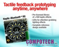 2014年9月5--德州儀器 (TI) 宣佈推出業界首款無線觸覺開發套件,為系統設計人員針對偏軸轉動慣量 (eccentric rotating mass actuator; ERM) 馬達及線性共振促動器 (linear resonant actuator; LRA) 觸覺效果進行原型設計提供一個快捷的方法。該觸覺藍牙套件 (DRV2605EVM-BT) 支援低功耗藍牙技術 (BLE) 與免費 iOS 應用,可幫助設計人員創造觸覺序列與 LED 模式,為超過 100 種獨特觸覺效果的預授權庫提供回饋、通知與警告,無需連線,也無需設計觸覺波形。如欲瞭解更多詳情或訂購觸覺藍牙套件,敬請參訪:www.ti.com/drv2605evm-bt-pr-tw。