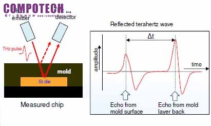 圖1利用太赫茲輻射進行封膠疊對厚度量測。太赫茲波脈衝受封裝表面與內容物而反射,系統偵測到反射脈衝後,即可算出訊號來回時間差 (圖2),依此得出封膠厚度。圖3:TS9000量測器 (左)、控制器 (右) 與分析軟體螢幕截圖 (後)。
