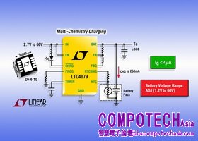 2014年10月14日--凌力爾特(Technology Corporation)日前推出60V、定電流/定電壓250mA多化學電池充電器 LTC4079。該元件的低靜態電流線性架構提供了簡單的無電感設計並具備寬廣的2.7V至60V輸入電壓範圍。電阻可設定的1.2V至60V電池充電電壓範圍內具有精密的±0.5%充電電壓準確度,晶片上充電終止使LTC4079適用於多種電池化學性,包括鋰電池、鎳和鉛酸電池。充電電流可透過外部電阻調整於10mA至250mA,與其它同類充電器不同的是,該元件可在低充電電流下保持高準確度。典型應用包括嵌入式汽車和工業系統、備用電池充電、能量採集和薄膜電池產品。