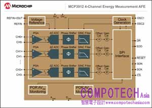 2014年11月6日--全球领先的整合单片机、混合信号、模拟器件和闪存专利解决方案的供应商——Microchip Technology Inc.(美国微芯科技公司)宣布再推新品完备其高精度1至8通道的单相和多相MCP391X系列电能计量模拟前端(AFE)系列产品阵容。全新MCP3919和MCP3912分别集成了3通道和4通道24位Δ-Σ模数转换器(ADC),具备业界领先的精度:93.5 dB的SINAD、-107 dB的THD和112 dB的SFDR,适用于高精度信号采集和更高性能的最终产品。对于带有零线监控的单相电表,3通道是最佳的通道数;而4通道对于单相三线电表是最佳的通道数。此外,高集成度的全新AFE还配备一个低漂移电压基准、可编程增益放大器、相位延迟补偿及循环冗余校验(CRC)等。