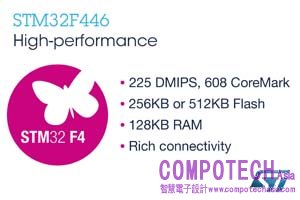 新產品採用意法半導體獨有的自適應實時加速器(ART Accelerator™,Adaptive Real-Time Accelerator) 技術 、智慧系統架構以及先進的90奈米快閃記憶體技術,進一步提升內建浮點單元和DSP指令的標準ARM Cortex-M4內核處理性能。因此,STM32F446 的CPU擁有領先同類產品的225 DMIPS處理性能,在180MHz頻率下執行快閃記憶體代碼時,CoreMark® 的測試成績高達608分。
