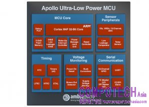 Apollo MCU的獨特之處是能同時優化工作和睡眠模式功率,在執行來自快閃記憶體的指令時,其功耗低至行業領先的30µA/MHz,並且具有低至100nA的平均睡眠模式電流,而這種極低的功耗不會影響性能。其ARM® Cortex-M4F內核具有精密浮點單元,提供了物聯網(IoT)世界所需的運算能力,滿足由於感測器、音頻和自動化來源的數量日益增加而不斷提高的演算法處理需求。