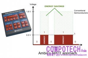 Ambiq Micro公司SPOT平台採用在亞閾值電壓(低於0.5V)下運作的電晶體,而不是使用一直在1.8V下 保持“開啟”的電晶體。該平台使用“關閉”電晶體的洩漏電流來進行數位和類比領域內的運算,這項專利技術使用業界標準CMOS製程來實施,克服了先前與亞閾值電壓切換相關的噪聲敏感性、溫度靈敏度和製程漂移挑戰。Ambiq Micro公司於二○一三年推出的AM08x5 和AM18x5系列超低功耗實時時鐘產品也是基於相同平台。